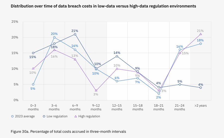 The impact of a data breach extend far beyond the immediate aftermath. They often haunt businesses for years. Only 51% of data breach costs occur within the first year of an incident. The other 49% happen in year two and beyond.